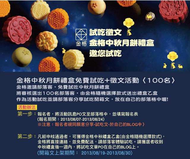 試吃徵文金格中秋月餅禮盒邀您試吃2013/8/7-201/8/24 fabye 發表在 痞客邦 留言(1) 人氣(1)